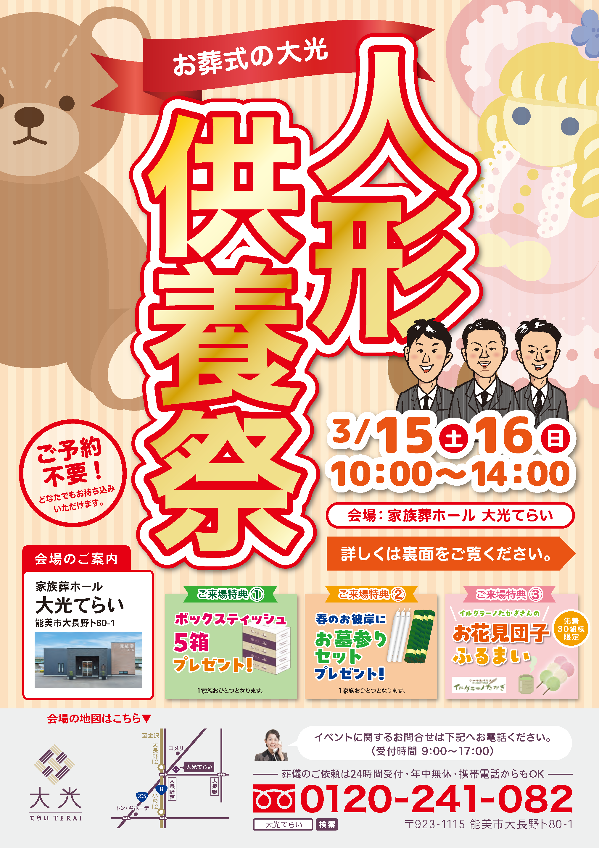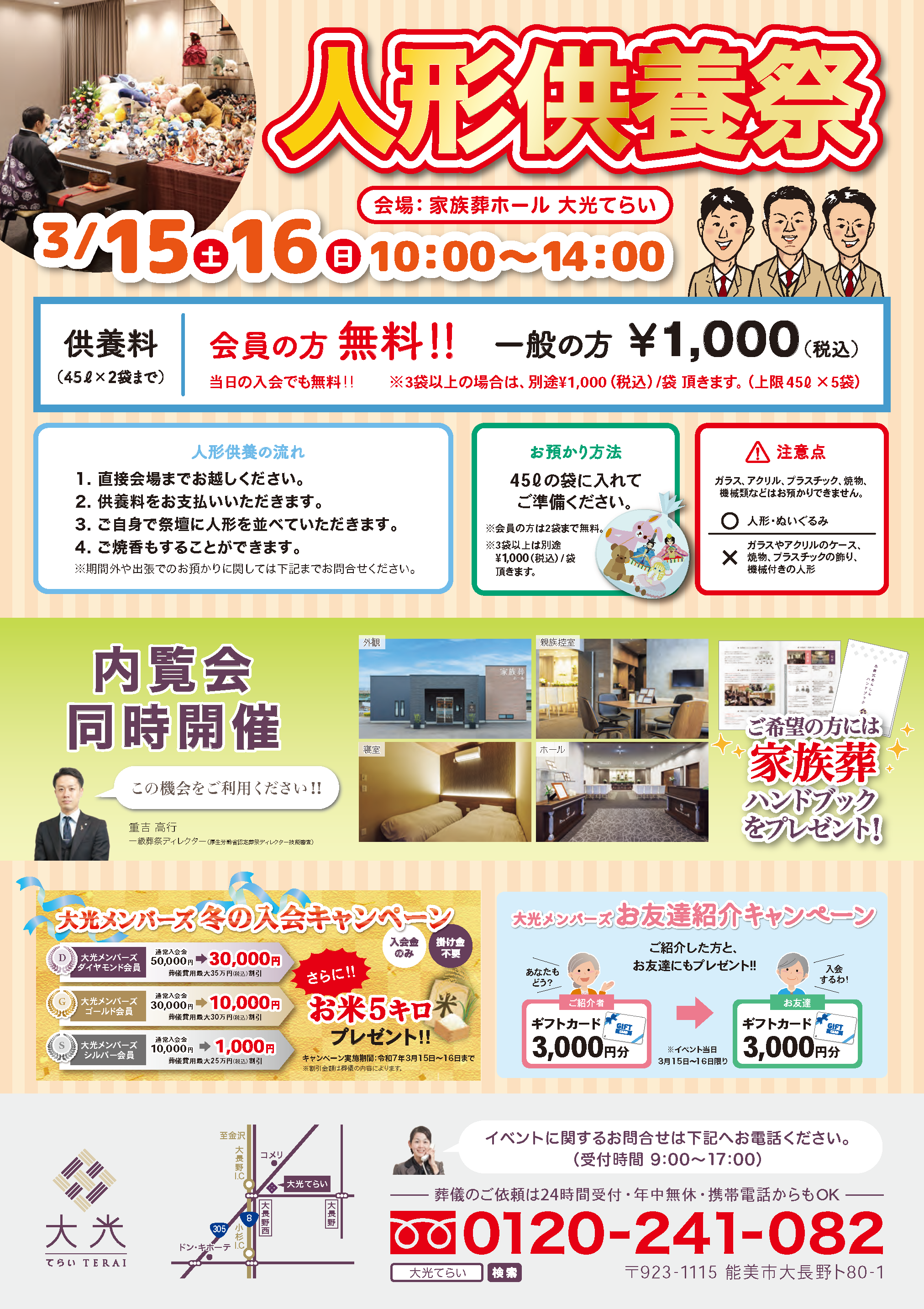 2025年3月15日〜16日、能美市大長野町「家族葬ホール 大光てらい」にて人形供養祭を開催いたします!